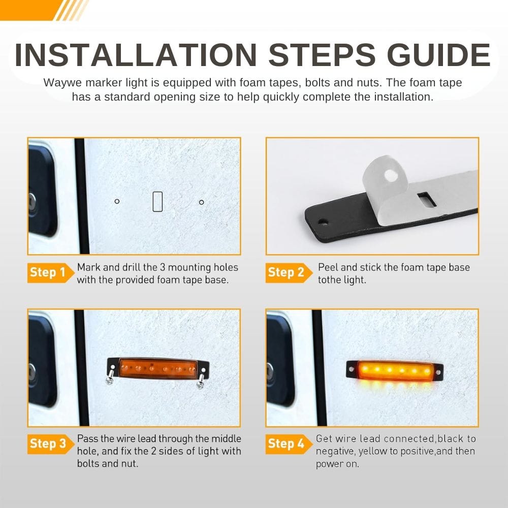- 10 Minute Installation: each light is equipped with a foam pad and the required bolts and nuts. The first step is to mark the installation hole position with a foam pad, and the second step is to stick the foam pad to the back of the light, pass the line through the reserved hole position, and lock both sides with studs and nuts. Finally, connect the wires, red and amber positive and black negative