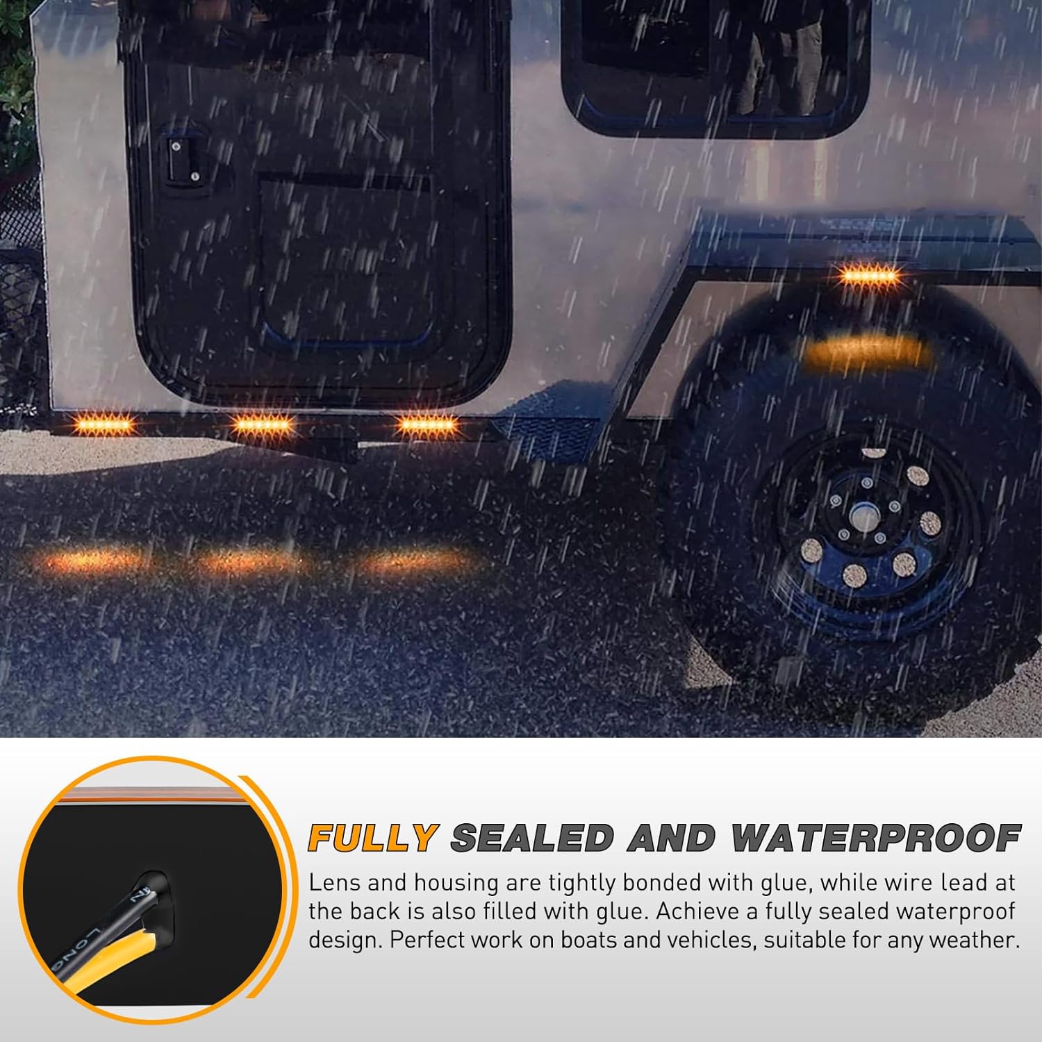 - Sealed Waterproof Design: This marker light adopts a glue sealed design, and the edges of the lens and base are tightly bonded through glue. At the outlet of the back, black hard glue has also been added to comprehensively prevent water ingress. The waterproof level reaches IP67