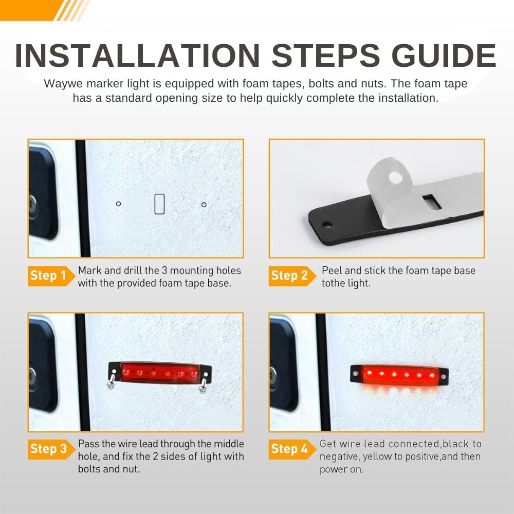 - 10 Minute Installation: each light is equipped with a foam pad and the required bolts and nuts. The first step is to mark the installation hole position with a foam pad, and the second step is to stick the foam pad to the back of the light, pass the line through the reserved hole position, and lock both sides with studs and nuts. Finally, connect the wires, red and amber positive and black negative