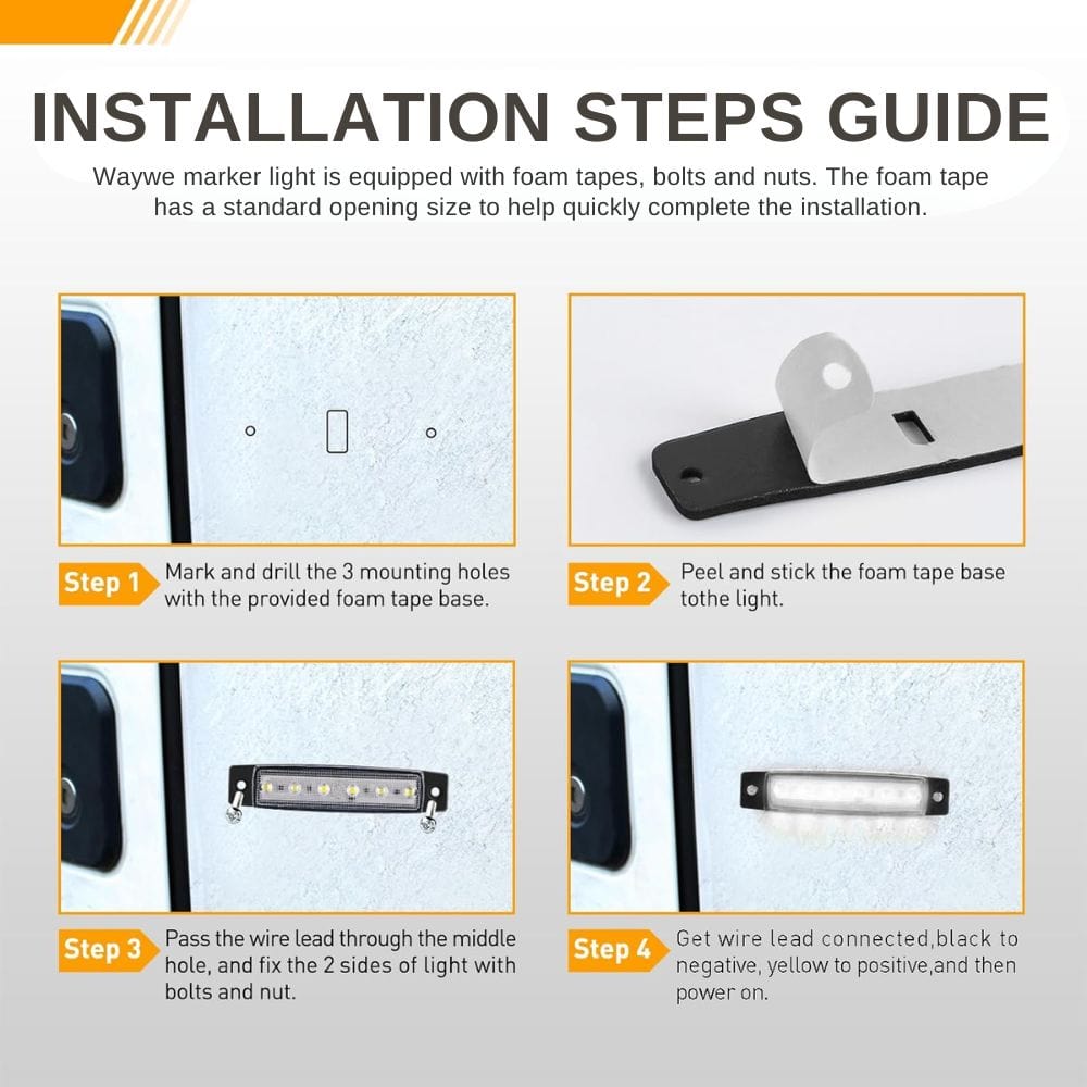 - 10 Minute Installation: each light is equipped with a foam pad and the required bolts and nuts. The first step is to mark the installation hole position with a foam pad, and the second step is to stick the foam pad to the back of the light, pass the line through the reserved hole position, and lock both sides with studs and nuts. Finally, connect the wires, red and amber positive and black negative