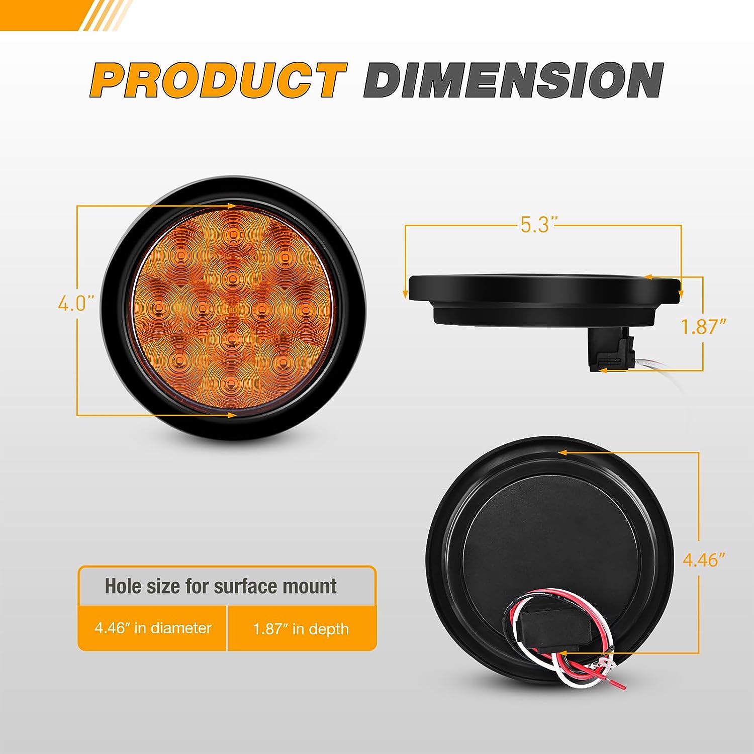 Waywe 4 Inch Round Trailer Tail Light 2 PCS 12 LED Amber Turn Signals Lights w/Surface Mount Grommets Plugs IP67 Waterproof for Truck RV Tractor