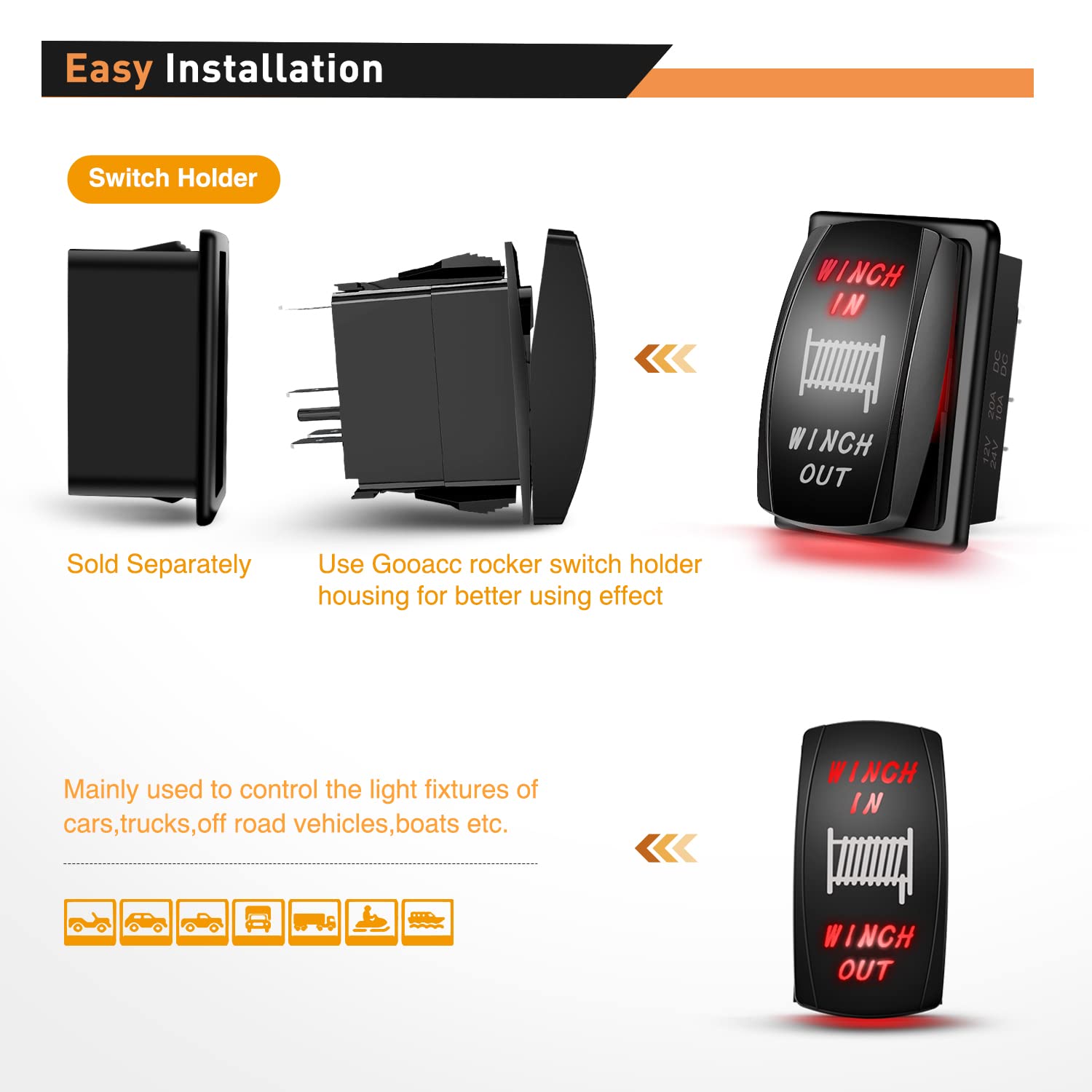 The product can install on rocker switch holder housing for better use effect. This product fits for most cars, SUV, ATV, UTV, 4X4, motorcycle, truck, Jeep Wrangler, boat, yacht, and other off-road vehicles.