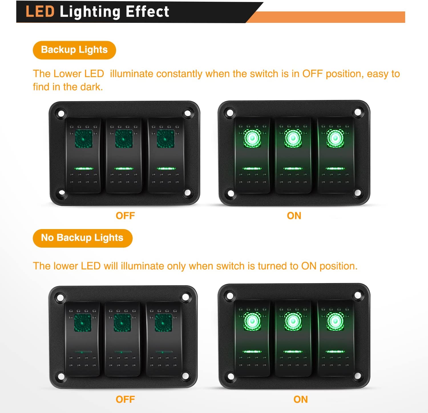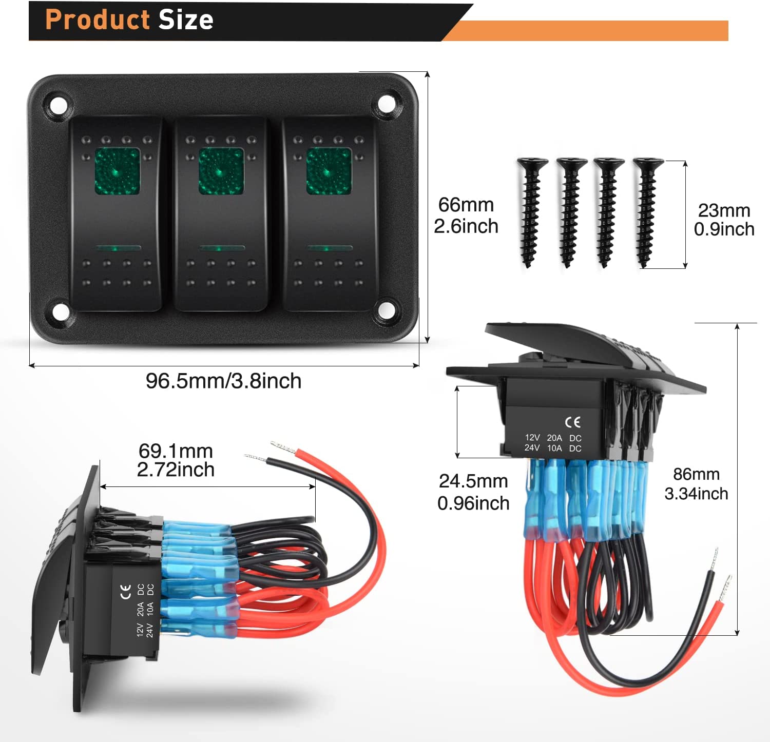 Waywe 3 Gang Aluminum Rocker Switch Panel Toggle Dash 5 Pin ON Off Pre Wired Rocker Switch Green Backlit Switch for Automotive Cars Boats RVs
