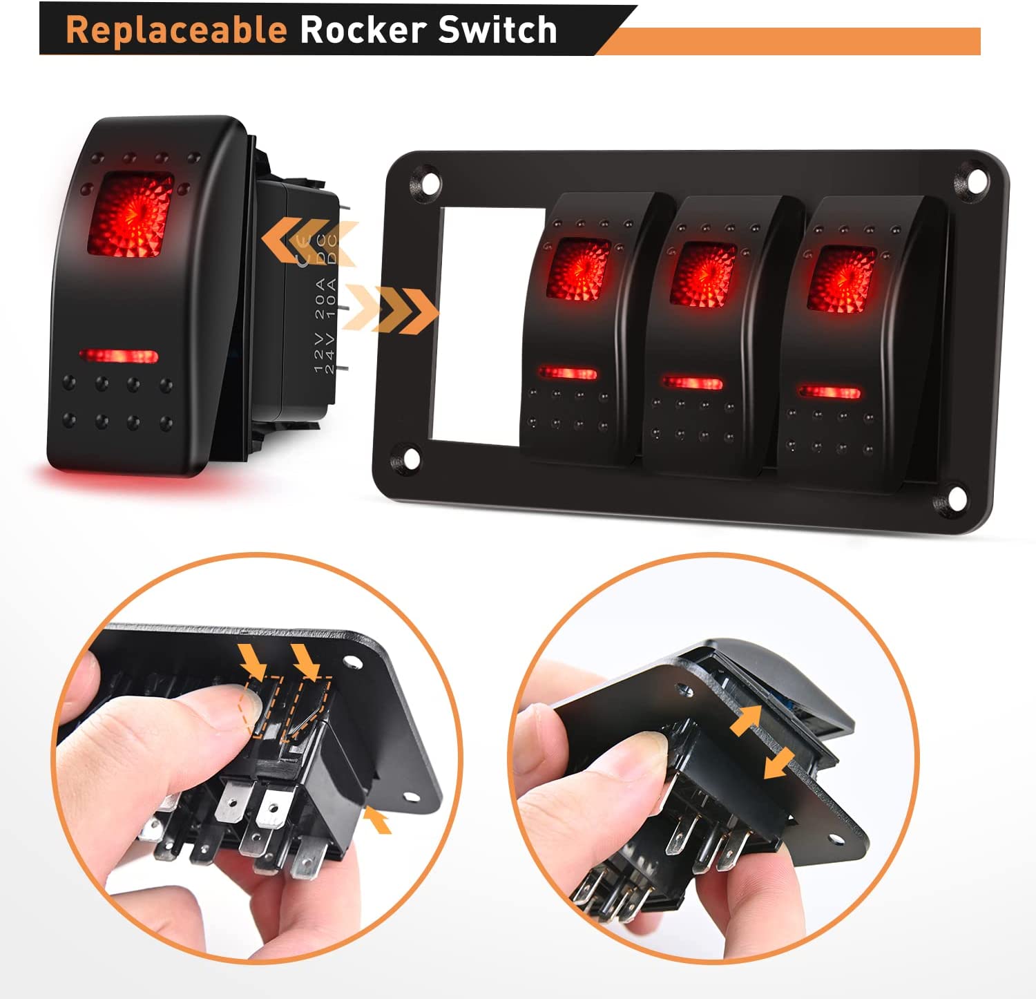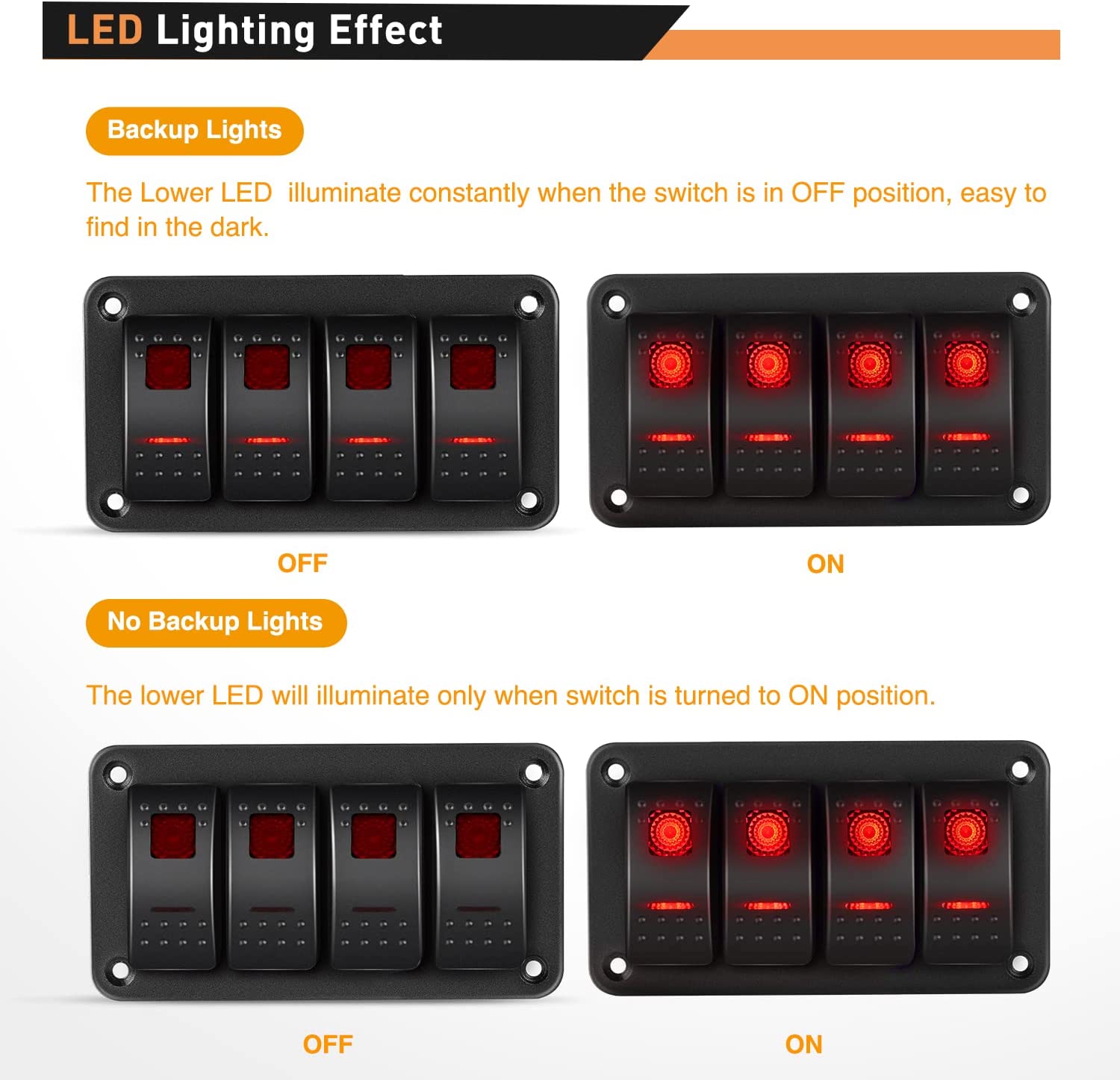 - 4 Gang rocker switch aluminum panel with DIY stickers and night glow stickers can customize these switches as your demands to remind you while using With pre-wired wiring harness for you to easily install in both 12V and 24VDC vehicles.