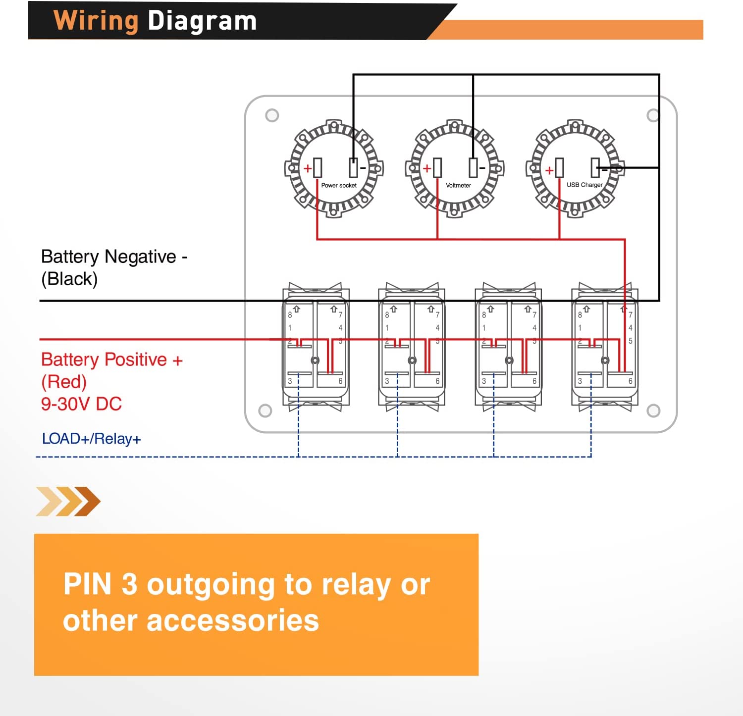 Rocker switch panel with pre-wired wiring harness for you to easily install in both 12V and 24V vehicle, yacht, ship, caravan, truck, etc.