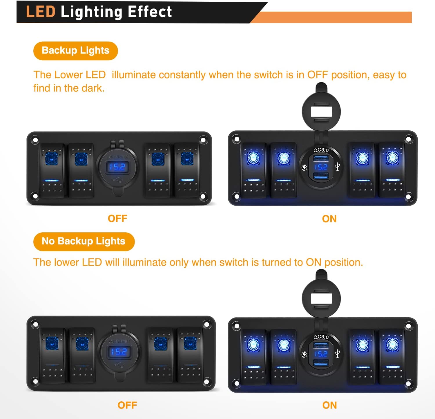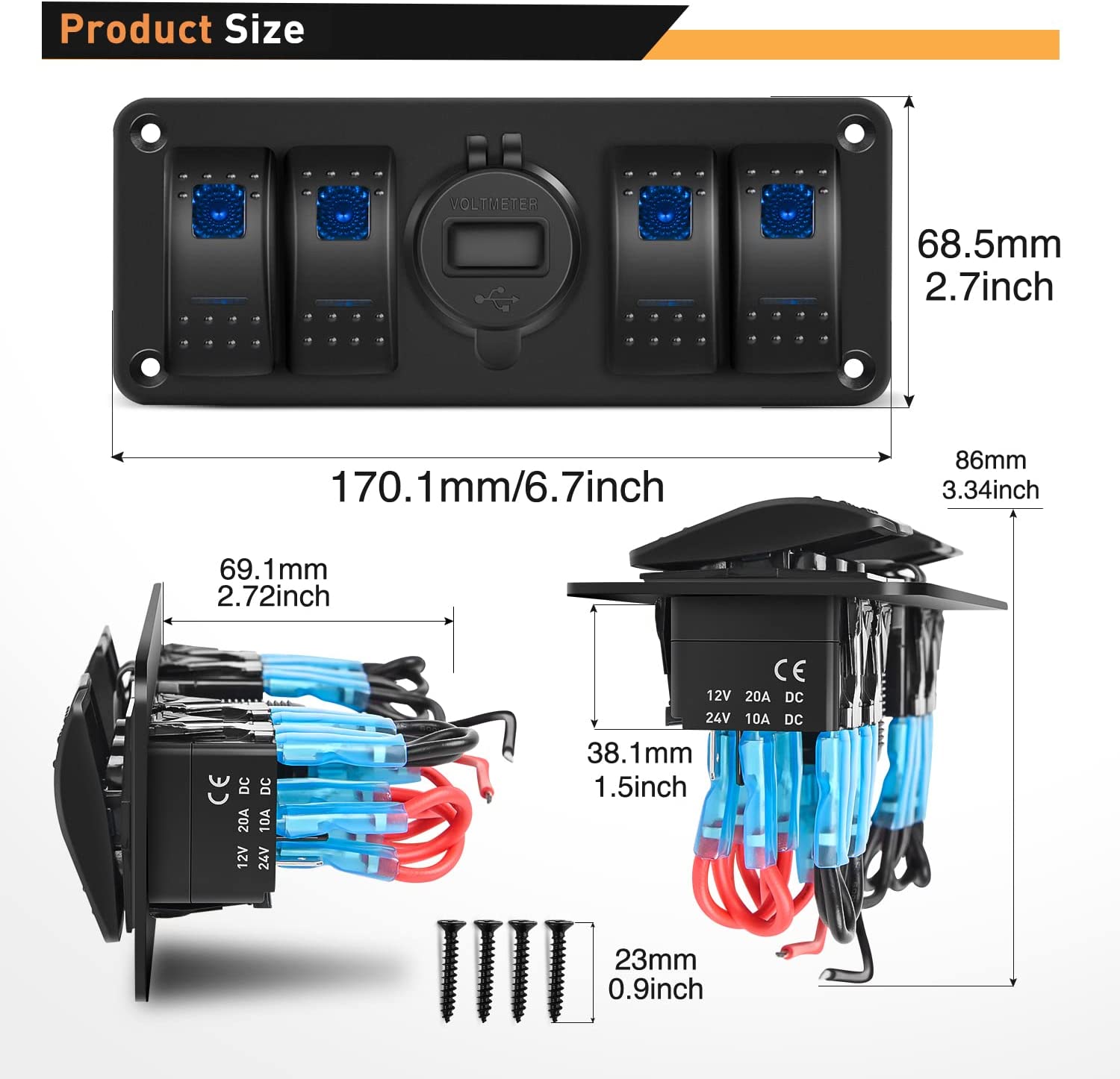 - Multi-Function designed: This Switch Panel is integrated with 4 Rocker switches and QC3.0 dual USB charger with Voltmeter. Suitable for most 12V-24V DC cars, UTVs/ATVs, trucks, trailers, RVs, caravans, buses, marine boats, yachts etc.
