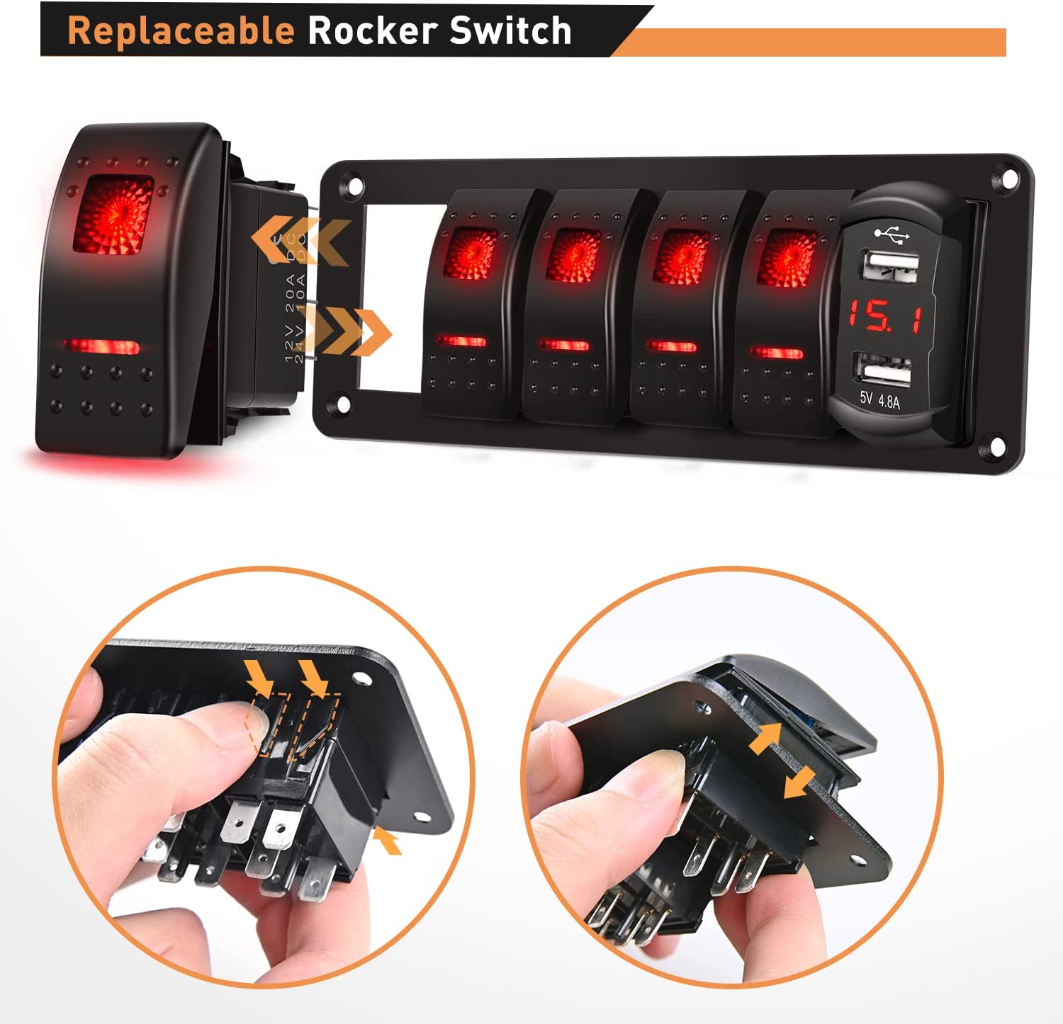 - Multi-function designed: this switch panel is integrated with 5 rocker switches and 4.8A dual USB charger with voltmeter. suitable for most 12v-24v dc cars, utvs, atvs, trucks, trailers, rvs, caravans, buses, marine boats, yachts etc.