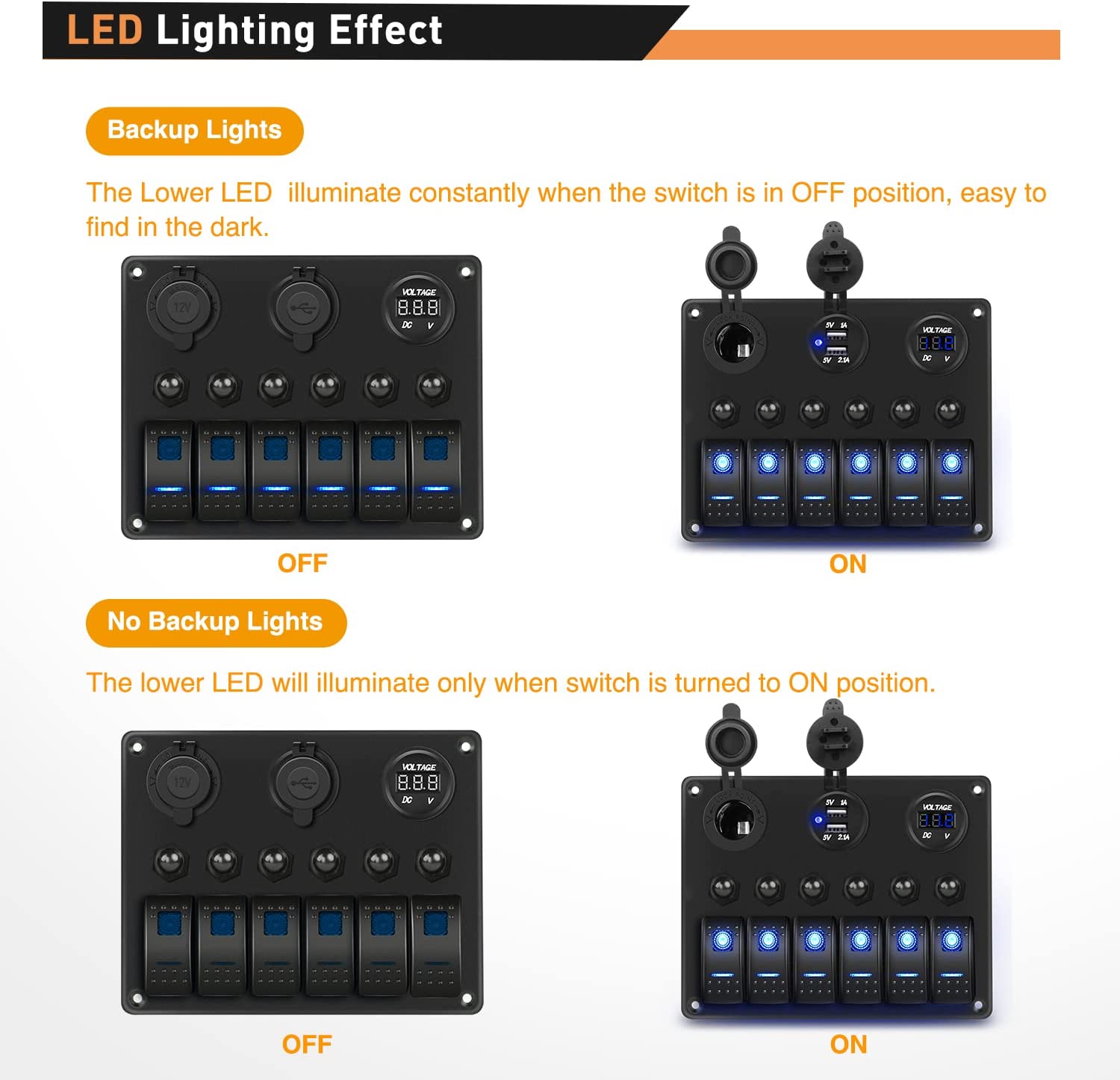 - multi-function switch panel 6 on/off 5pin green led rocker switch 6 circuit breakers for overload protection 12v cigarette socket 5v/2.1a & 5v/1a dual USB charger port and digital voltmeter great for all types of circuit control charging needs and voltage monitoring