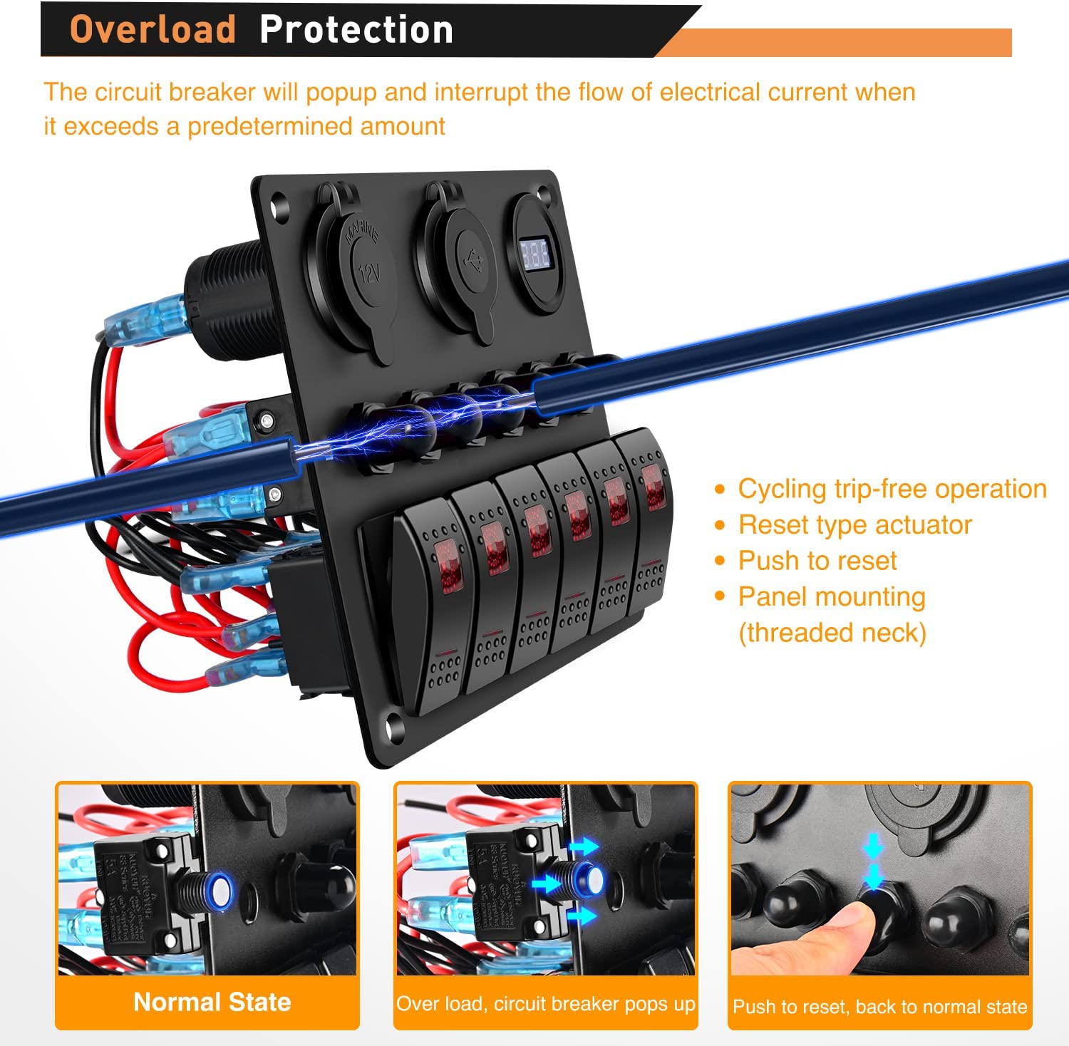 - multi-function switch panel 6 on/off 5pin green led rocker switch 6 circuit breakers for overload protection 12v cigarette socket 5v/2.1a & 5v/1a dual USB charger port and digital voltmeter great for all types of circuit control charging needs and voltage monitoring