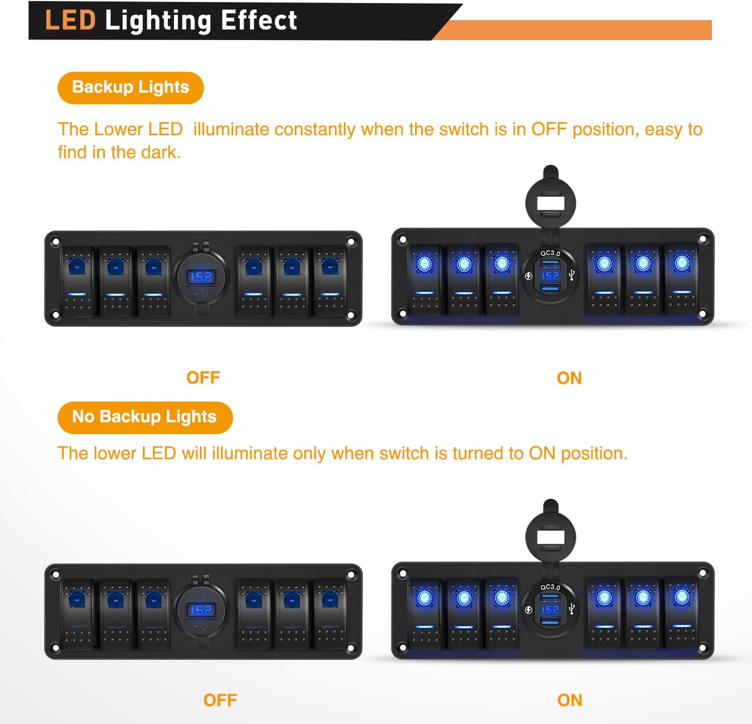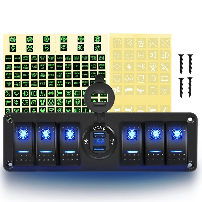 - Multi-Function designed: This switch panel is integrated with 6 20amps Rocker switches. Rated at 12VDC and a QC3.0 dual USB charger with LED voltmeter. Suitable for most 12V-24V DC cars, UTVs/ATVs, trucks, trailers, RVs, caravans, buses, marine boats, yachts etc