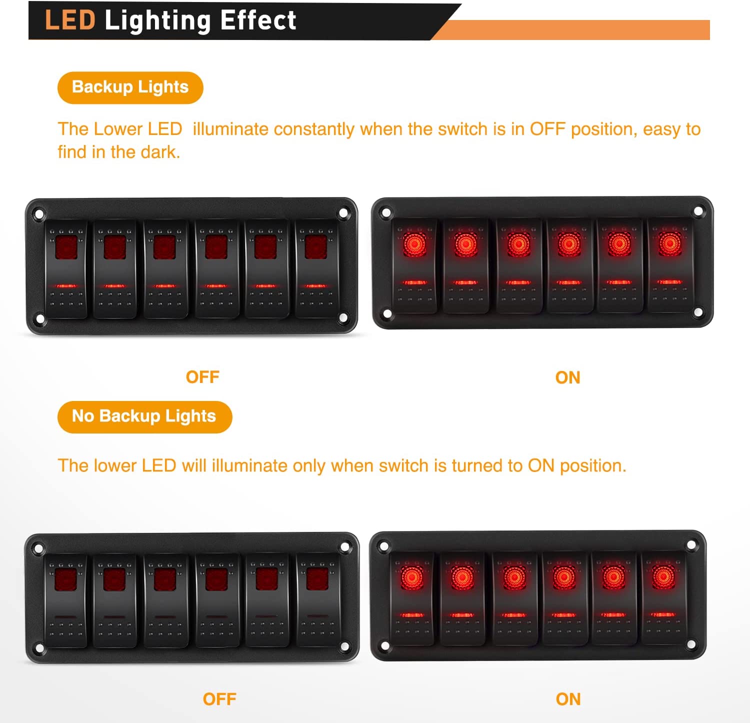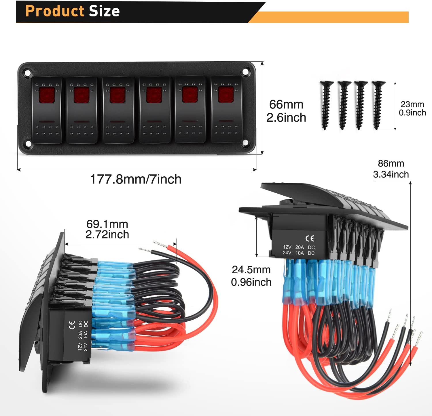 - 6 Gang rocker switch aluminum panel with DIY stickers and night glow stickers can customize these switches as your demands to remind you while using With pre-wired wiring harness for you to easily install in both 12V and 24VDC vehicles.