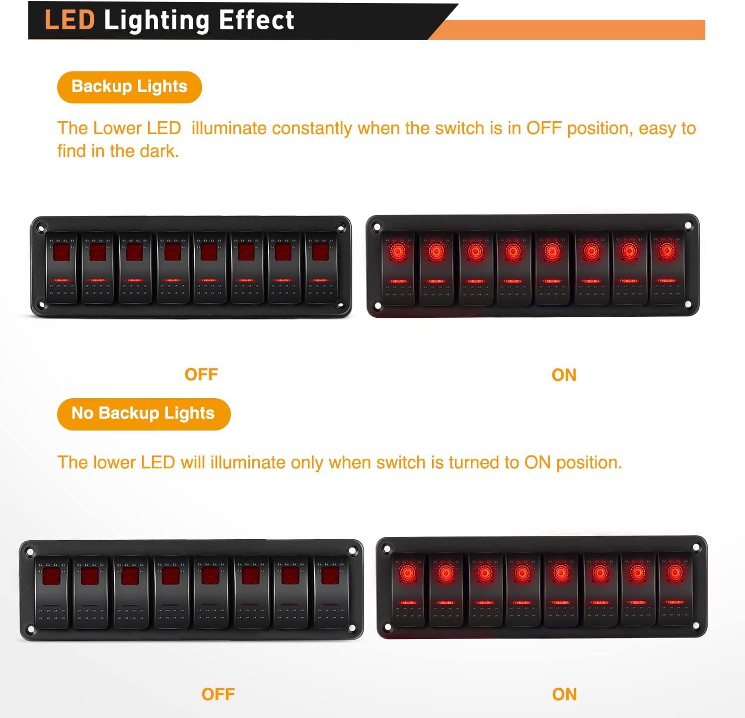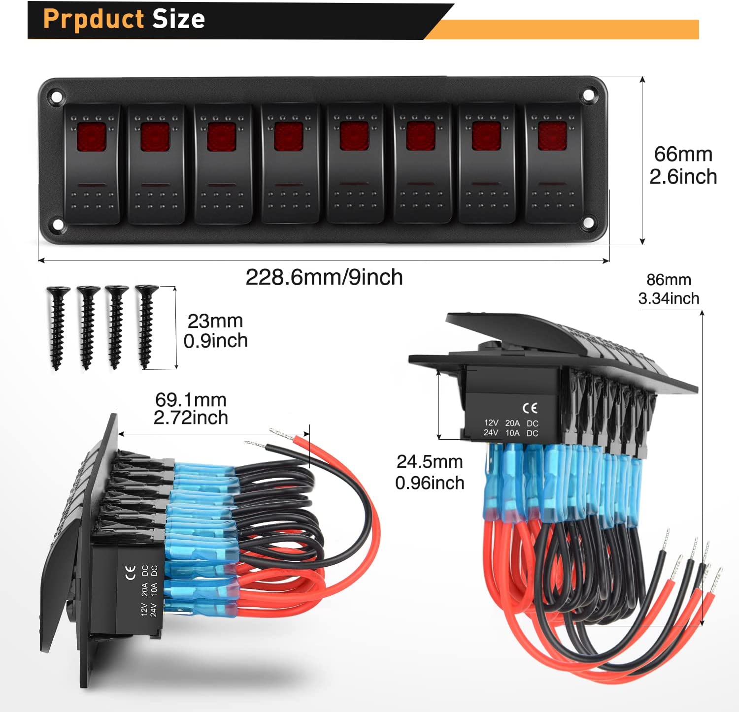 - 8 Gang rocker switch aluminum panel with DIY stickers and night glow stickers can customize these switches as your demands to remind you while using With pre-wired wiring harness for you to easily install in both 12V and 24VDC vehicles.