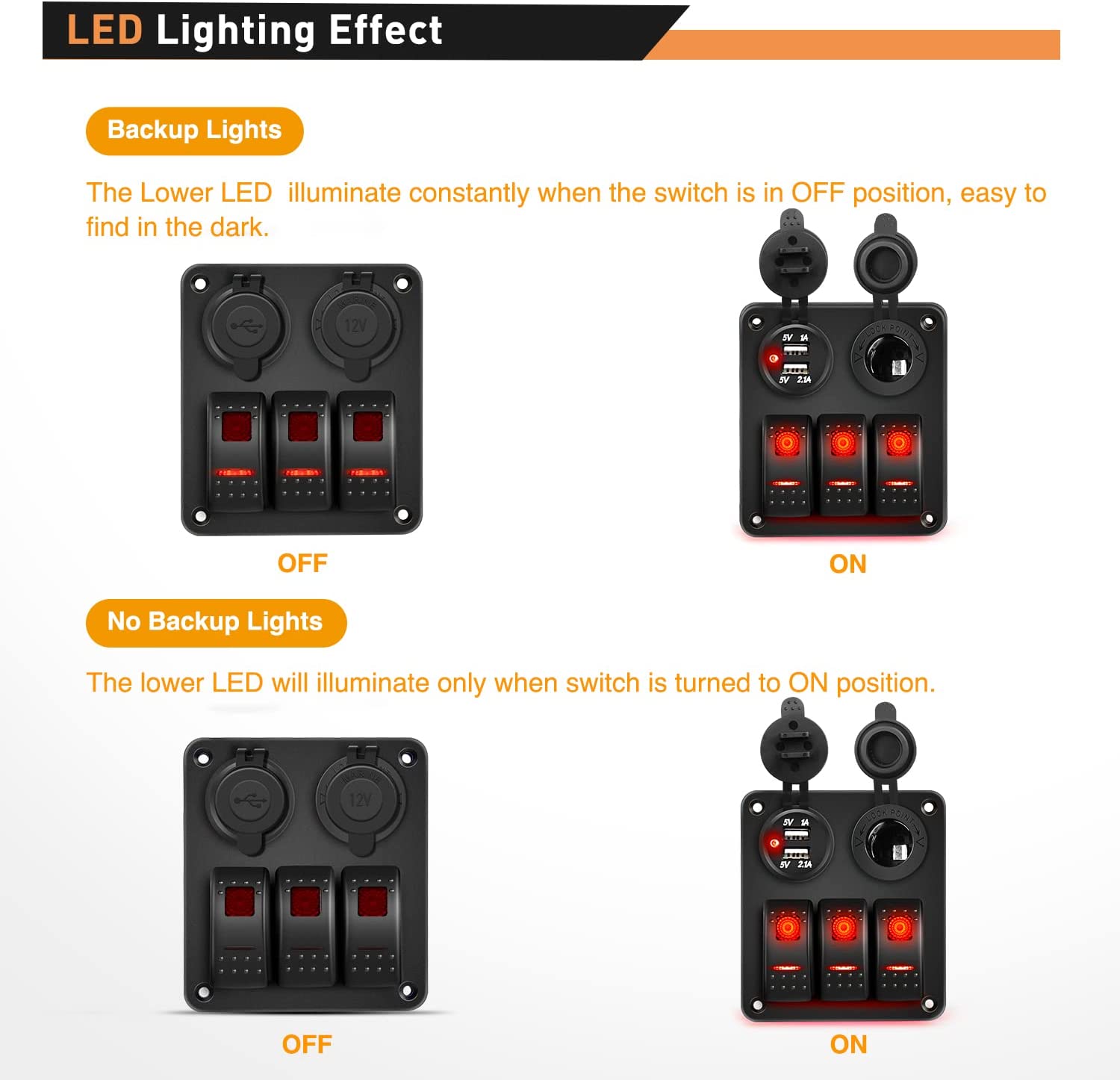- Multi-functional Panel: 3 Gang switch panel with 12V cigarette socket and dual USB charger, great for all types of circuit control and charging needs. All-in-one design can be DIY used to control any vehicle electrical appliances. Universally fit for 12V-24V vehicles, widely applicable for trucks, jeeps, trailers, RVs, caravans, bus, marine boats, yachts,etc