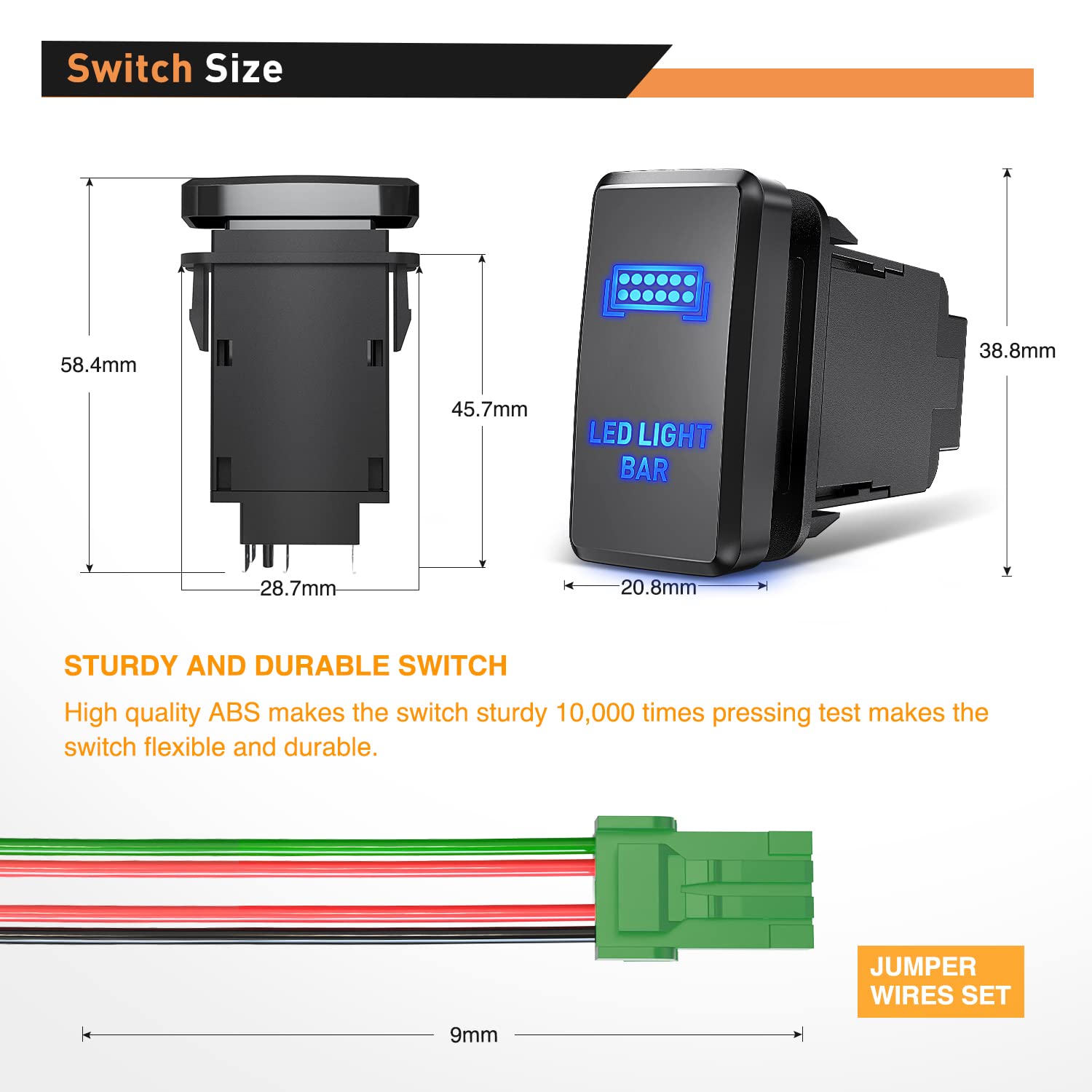 Made of ABS and PC of premium quality, the switch is impact and heat resistant. all patterns are laser etched directly onto the switch surface to ensure long lasting durability.