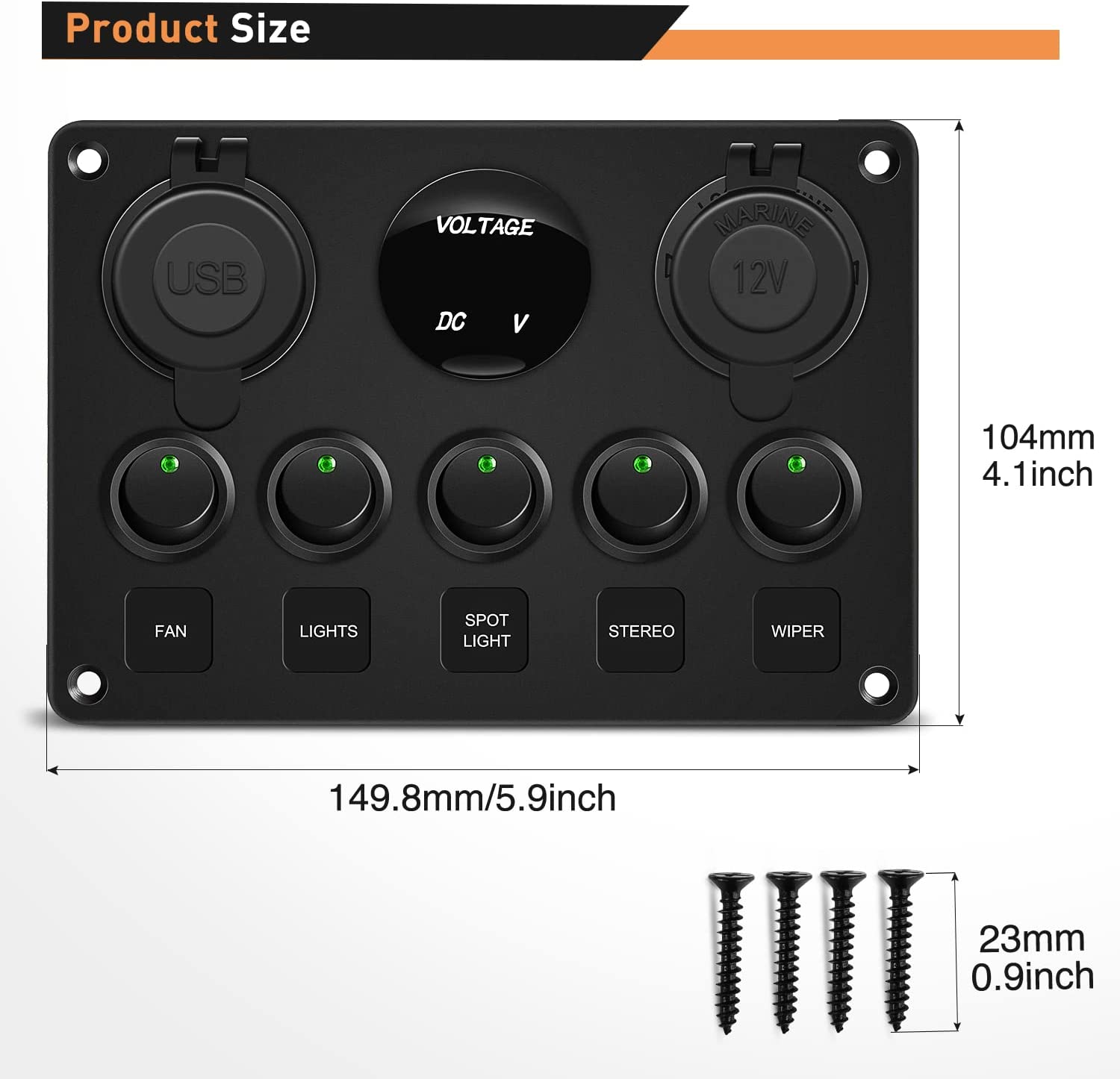 - Multi-function switch panel: product integrated with dual USB charger, digital voltmeter, 12v outlet, waterproof panel and 5 on/off rocker switches, this 12v/24vdc switch panel can meet your various needs