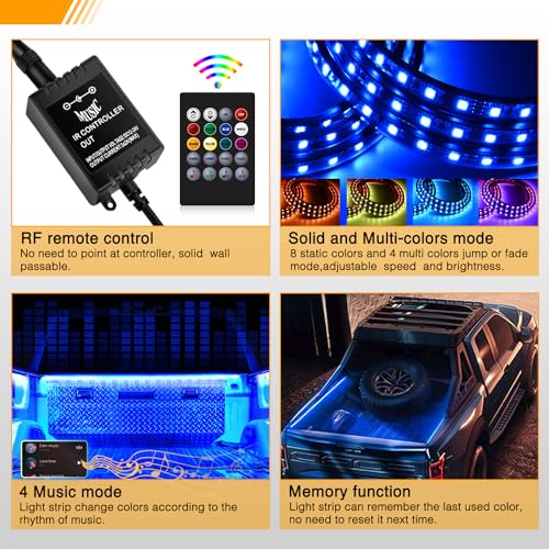 - Multiple Function Options: Choose from 8 preset static colors, 4 lighting effects, and 4 voice control modes. RF remote control, no need to point at controller, solid wall passable, can remote control light strip over a long distance. The light strip can sync with music, allowing you to adjust the speed, brightness, and even remember the last used color with the memory mode