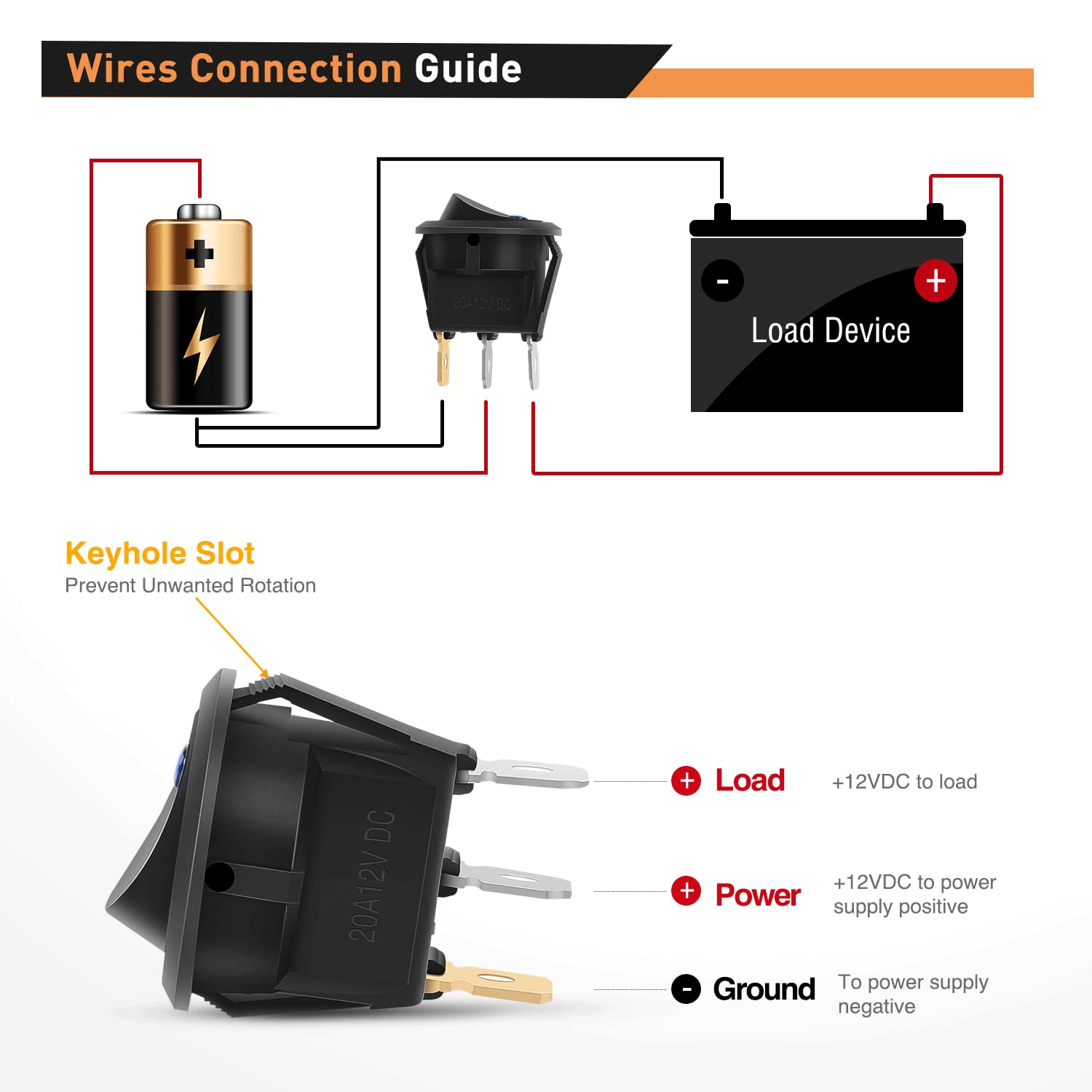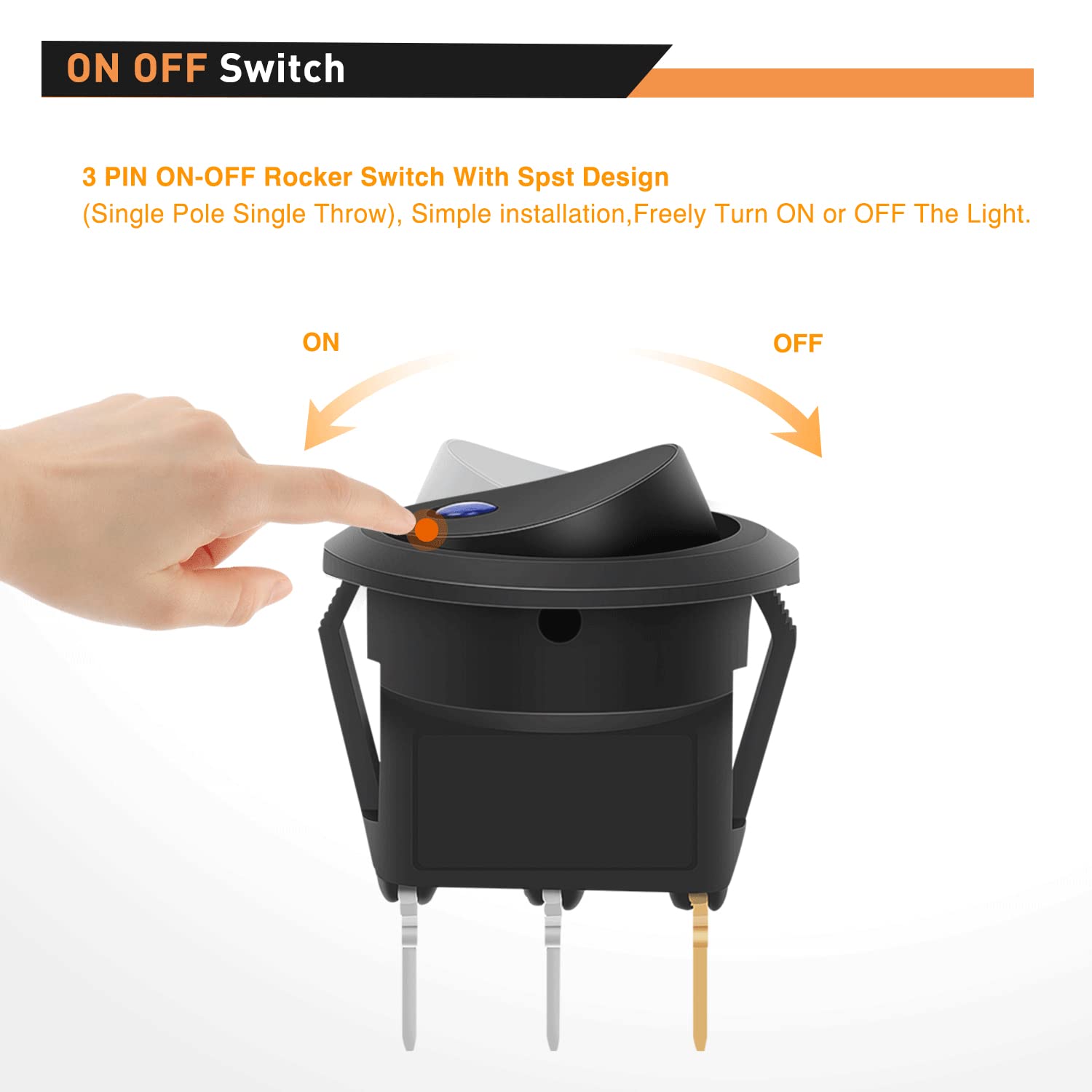 - Perfect Design: Designed to connect and disconnect a DC12V 20A electrical circuit at will, SPST: ON-OFF control; 2 pole design (On/Off), 3rd poles with LED to be connected to earth. Fluorescent lamps will be lighted up when the switch is turned on