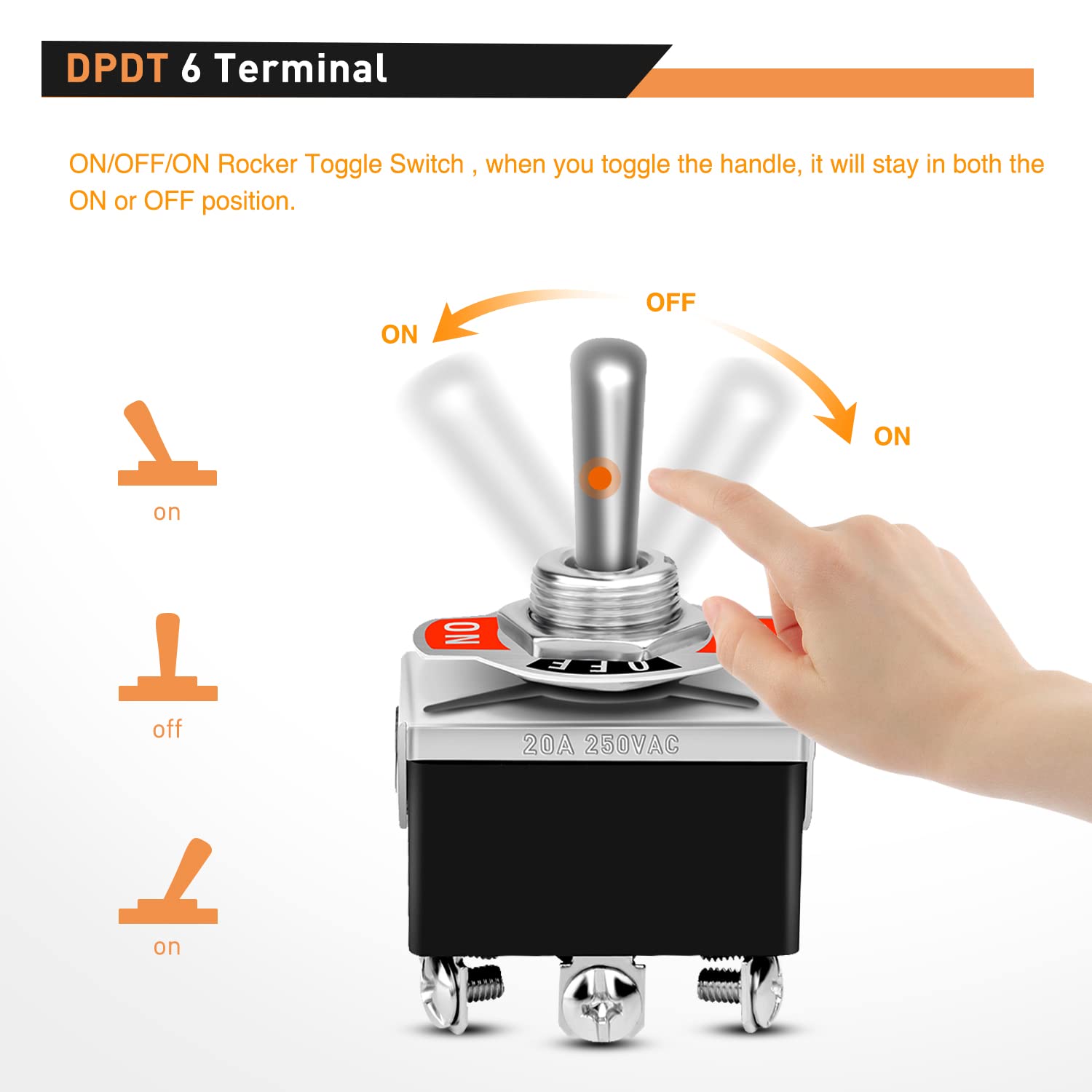 Waywe 5 Pack 6Pin Heavy Duty Rocker Toggle Switch 15A 250V 20A 125V DPDT 6 Pin ON Off ON Switch Metal Bat Waterproof Boot Cap Cover