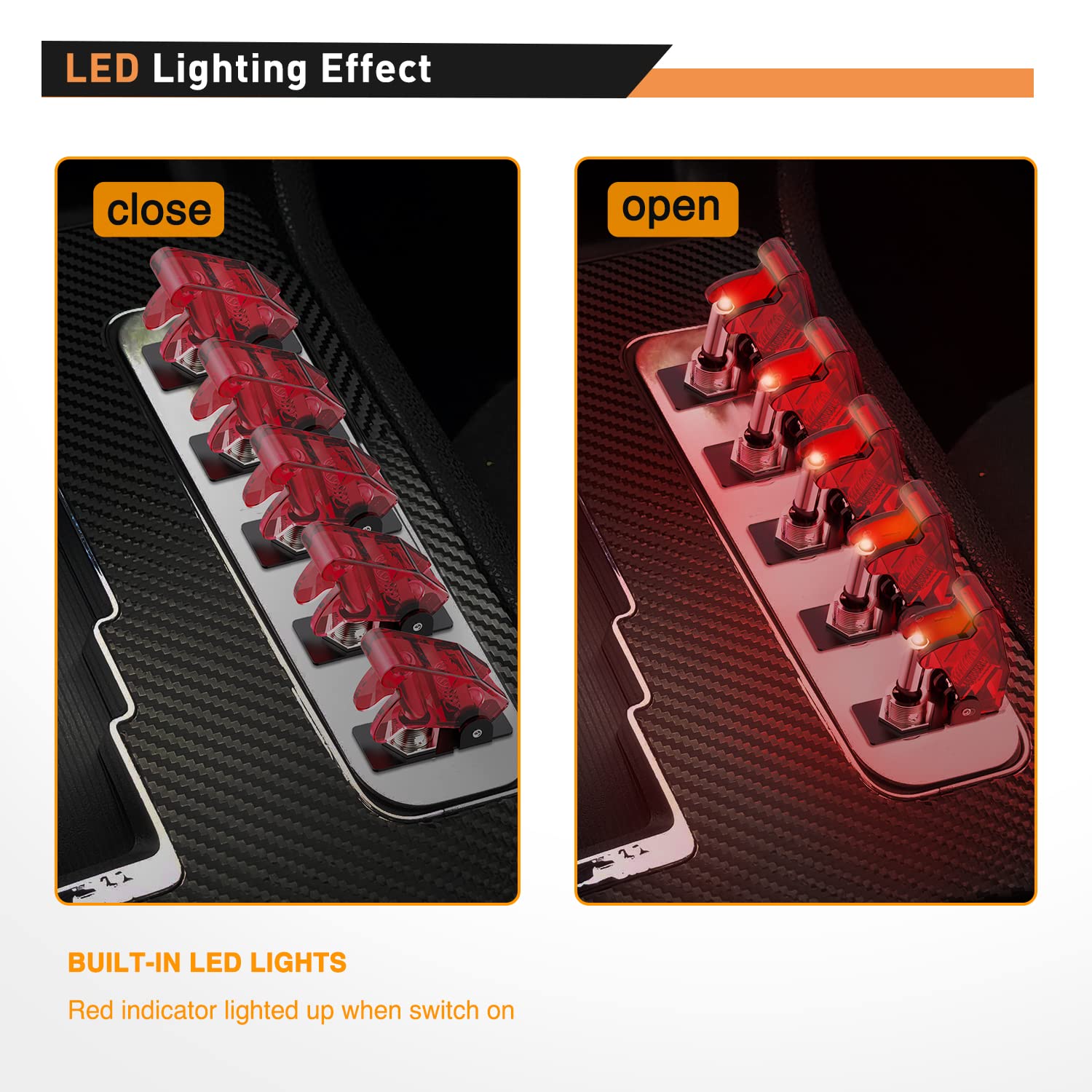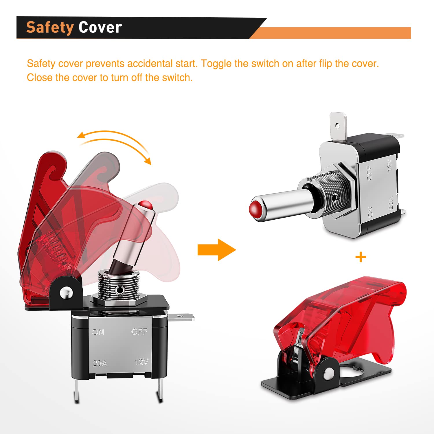 - Safety cover: Transparent red "aircraft" style safety cover prevents accidental start. The toggle switch can be turned on only after you flip the switch cover and toggle it to on position. And the switch get off automatically when you close the cover.