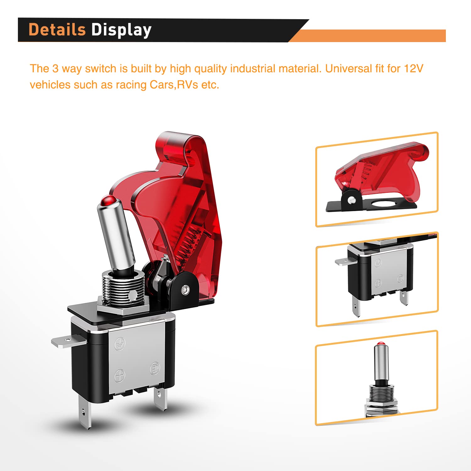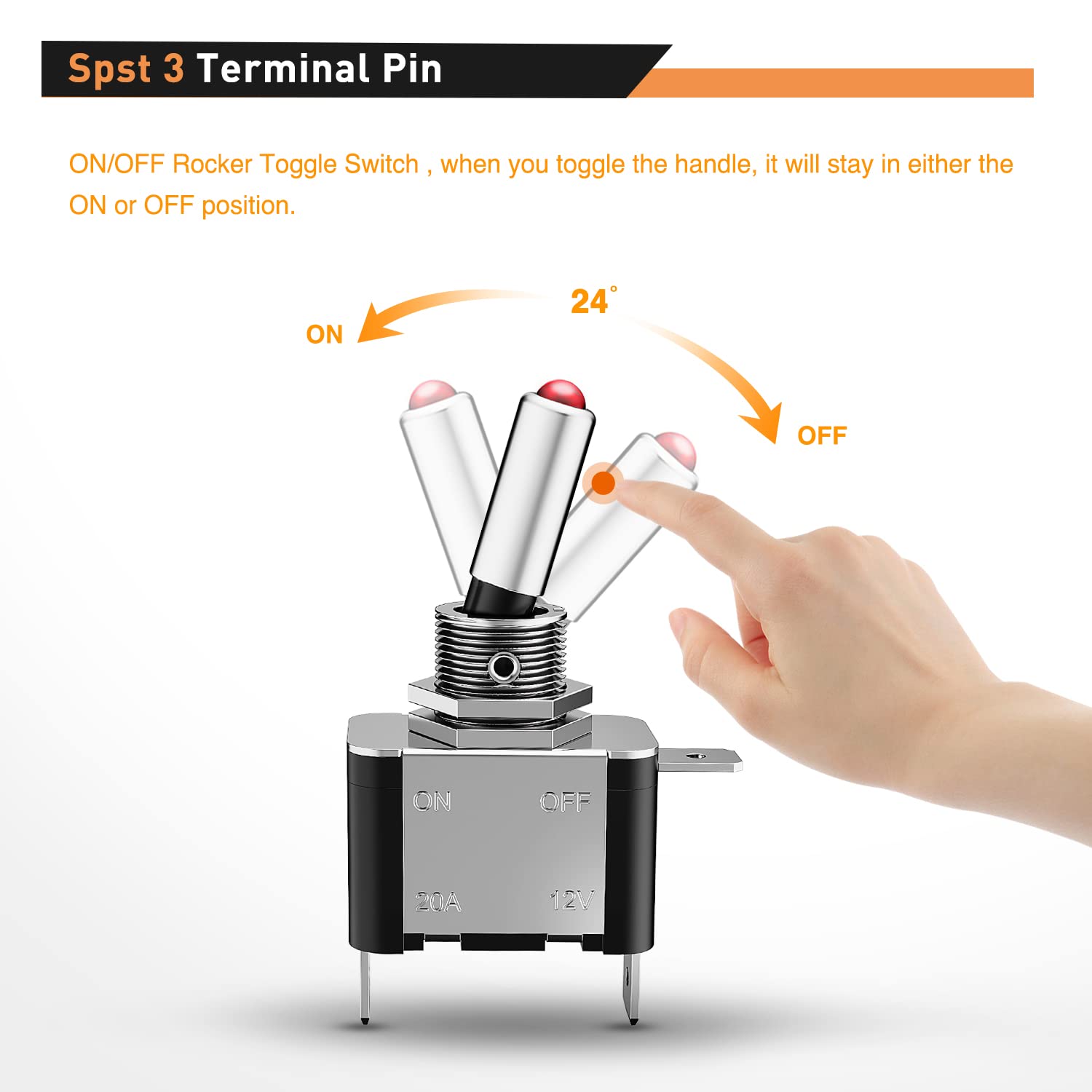 - Function: Red LED toggle switch with 3 pin blade type terminals, SPST design(single pole single throw), Rated at 20A 12V DC and designed with rocker style easy to turn on and off.