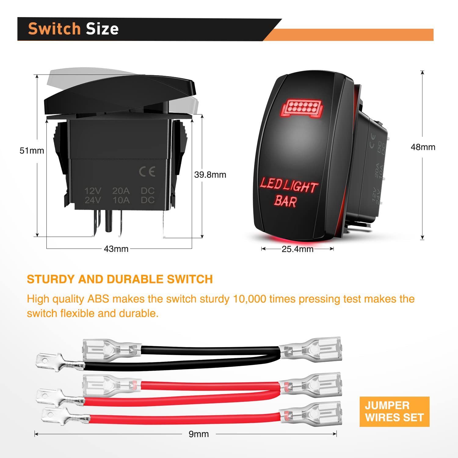 Waywe LED Light Bar Rocker Switch 5Pin Laser On Off Lights 20A 12V 10A 24V Switches Red Jumper Wires Set for Jeep Boat Trucks