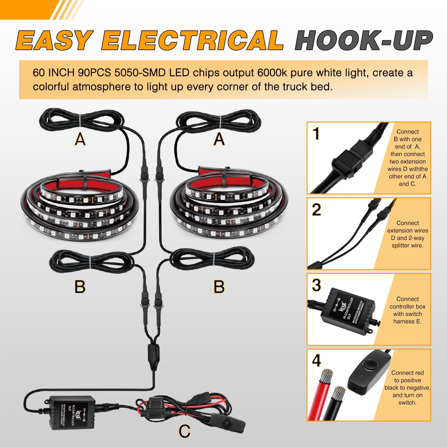 - Easy Installation: The RGB truck bed light strip comes with self-adhesive tape and extra cable ties, screws, and fasteners. Simply clean the mounting location, peel and stick the light bar on any surface you desire. It's hassle-free and convenient