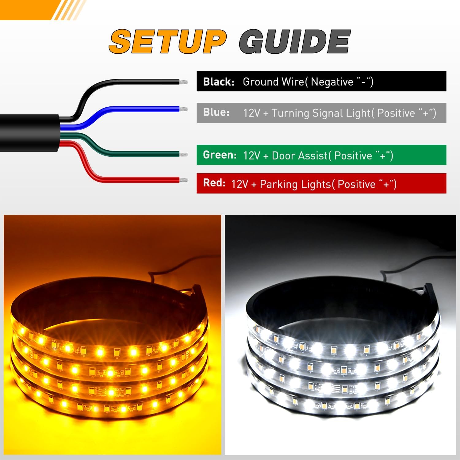 - Super bright: This 60inch running board lights feature 144pcs high intensity LED chips, providing amazing super bright lighting output. It includes 72 LEDs of white for door/step/DRL/parking lights and 72 LEDs of amber color for sequential turn signal lights