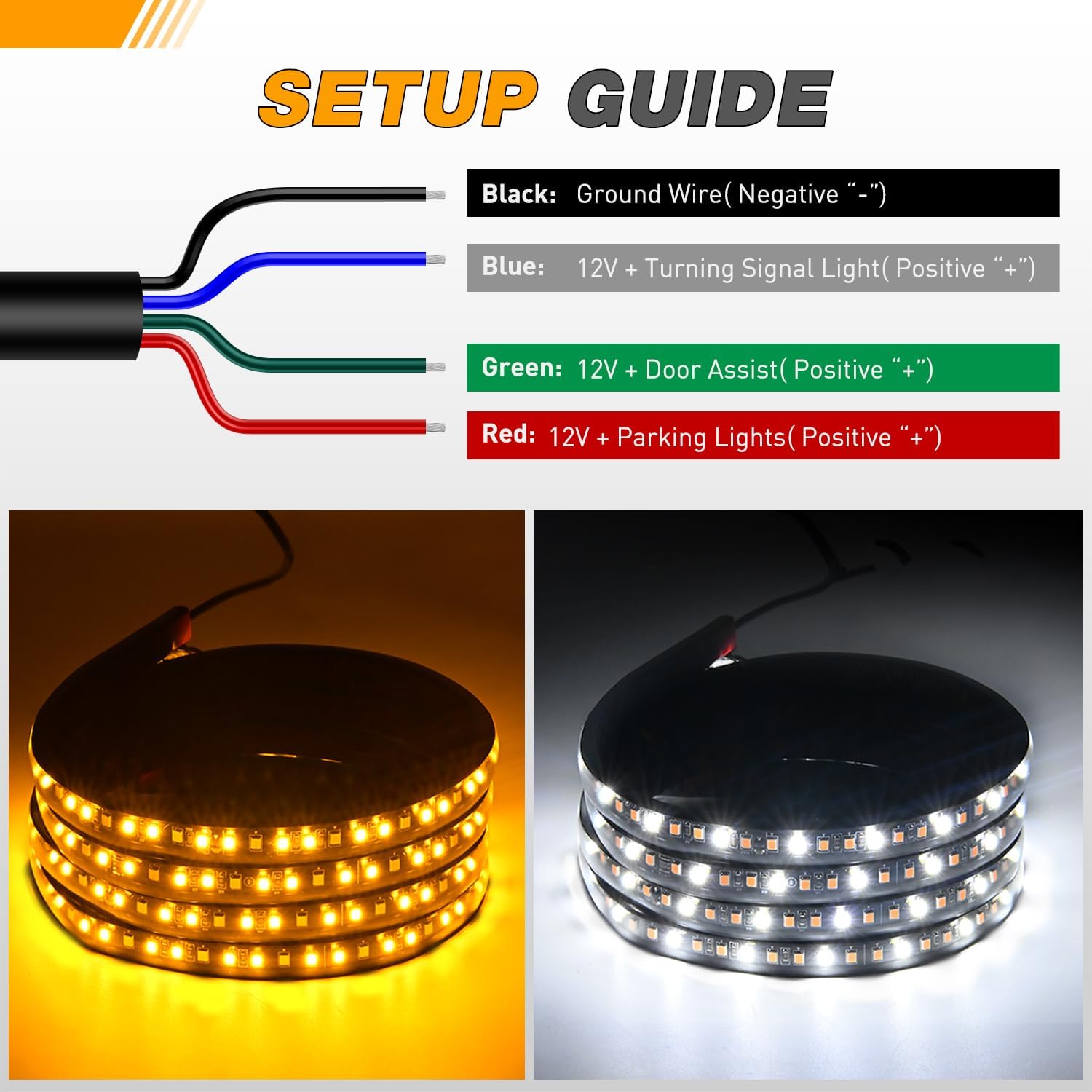 - Super bright: This 70 inch running board lights feature 216 pcs high intensity LED chips, providing amazing super bright lighting output. It includes 72 LEDs of white for door/step/DRL/parking lights and 144 LEDs of amber color for sequential turn signal lights